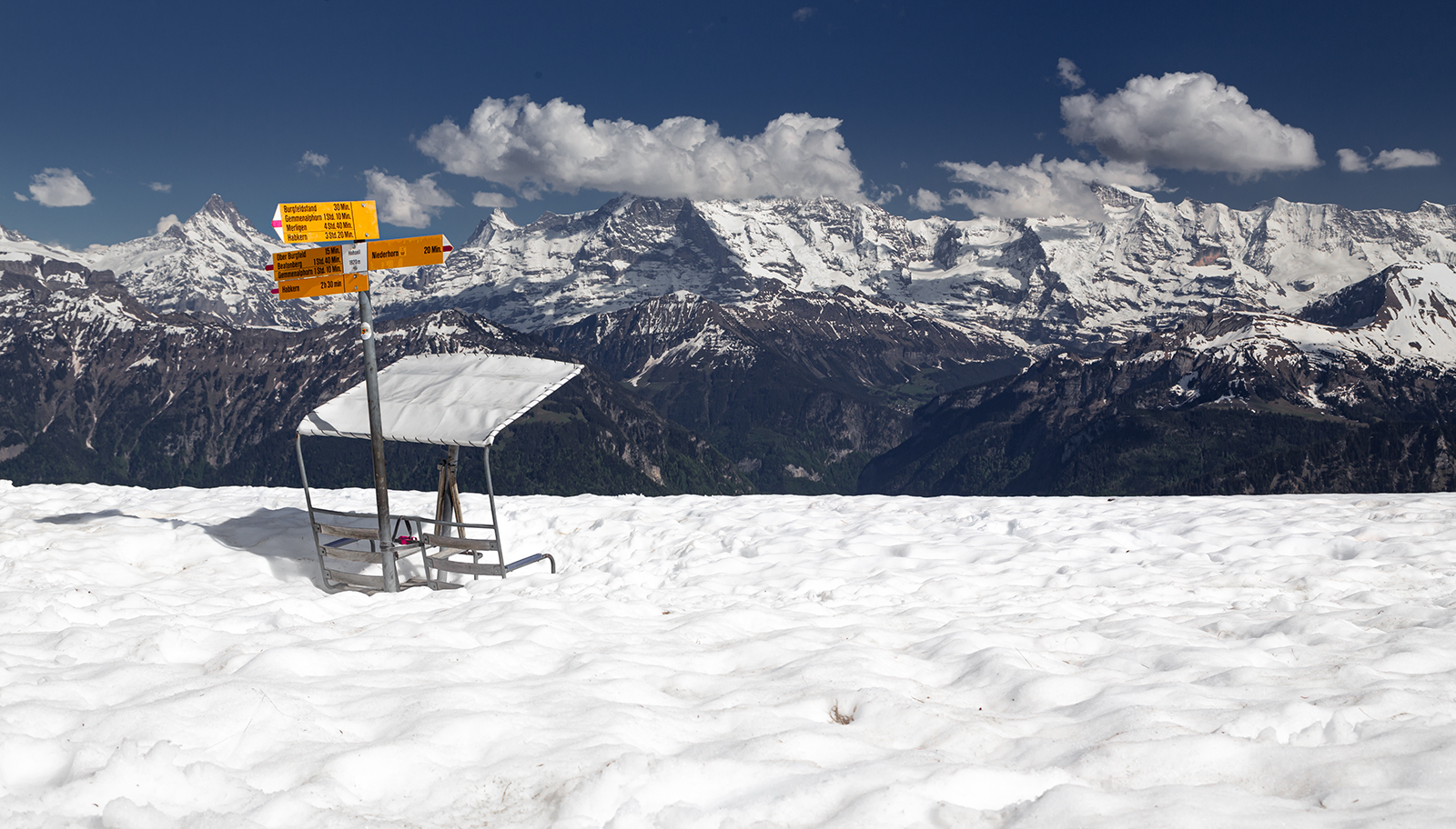 Zum meteorologischen Sommerbeginn kann auf dem Niederhorn (1950m) noch viel Schnee liegen.