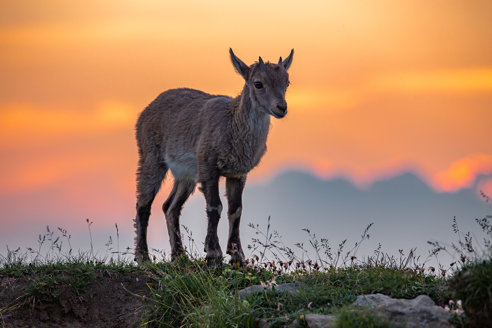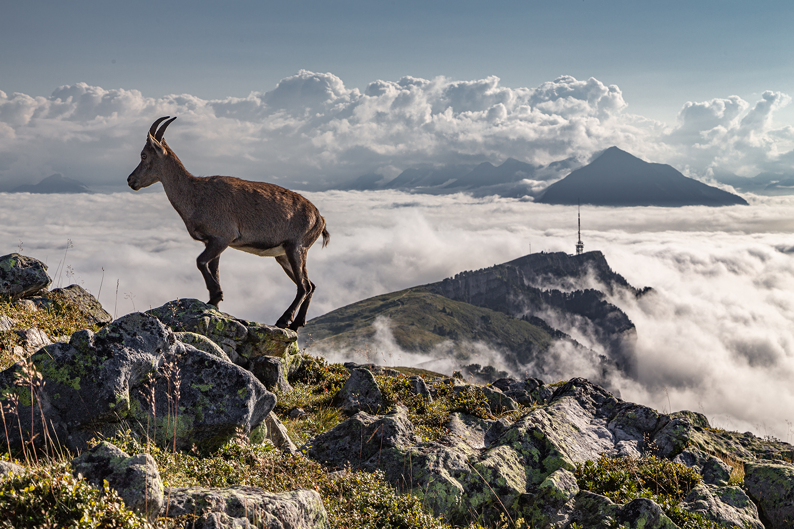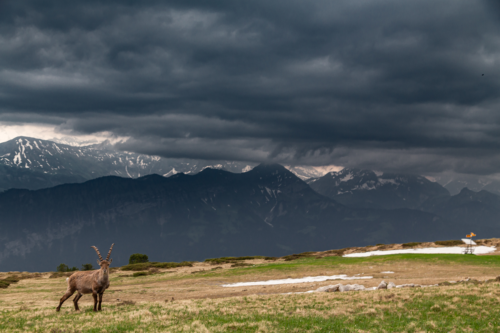 Steinbock im Vorfeld eines aufziehenden Gewitters – noch ist es trocken.