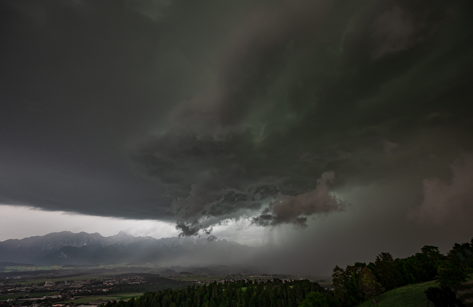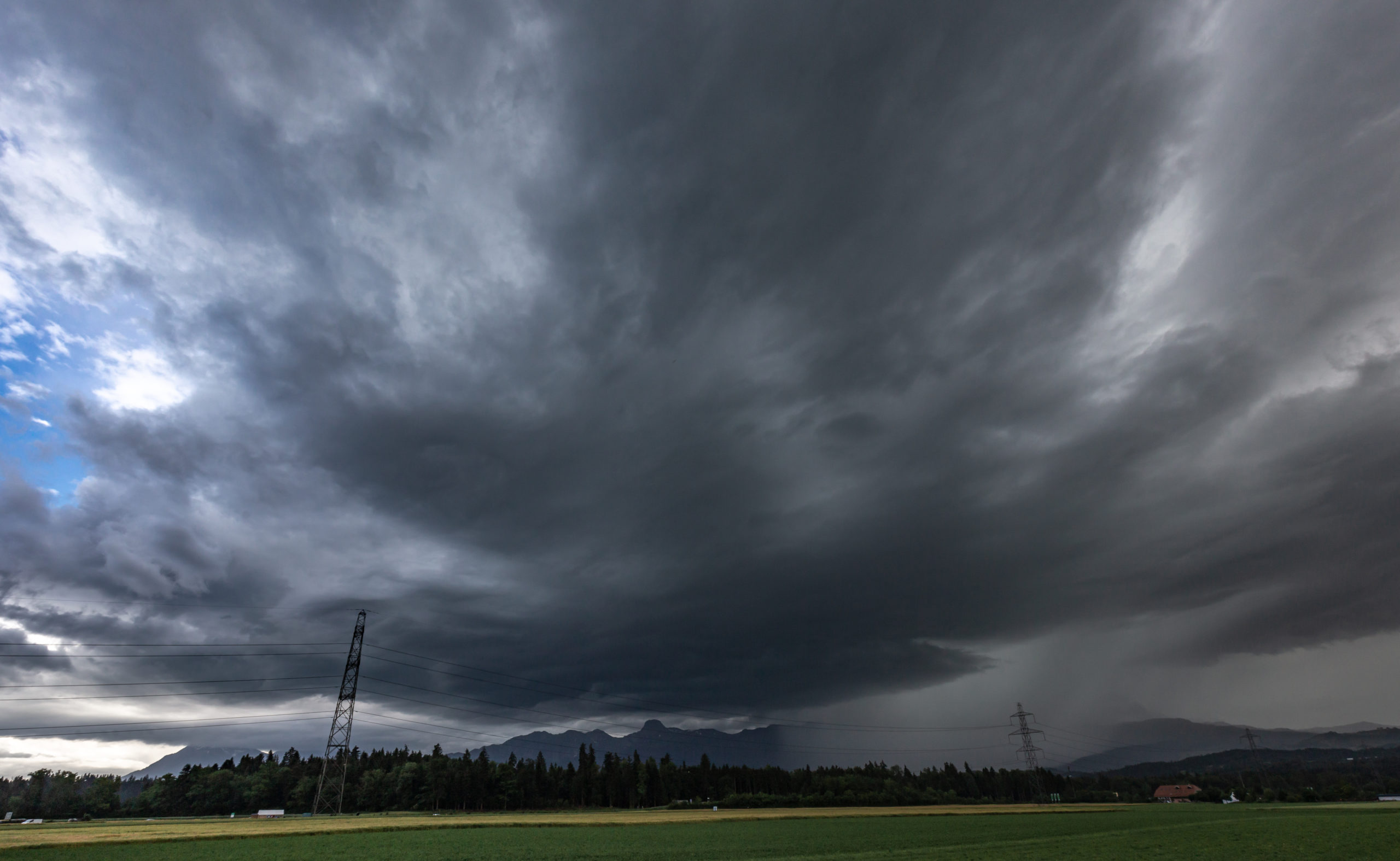 Kiesen – eine kleine Superzelle bildet sich an der Stockhornkette. Auf- und Abwind sind klar getrennt, ein Hagelgewitter entsteht.