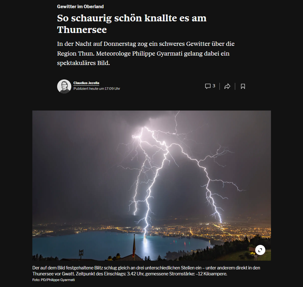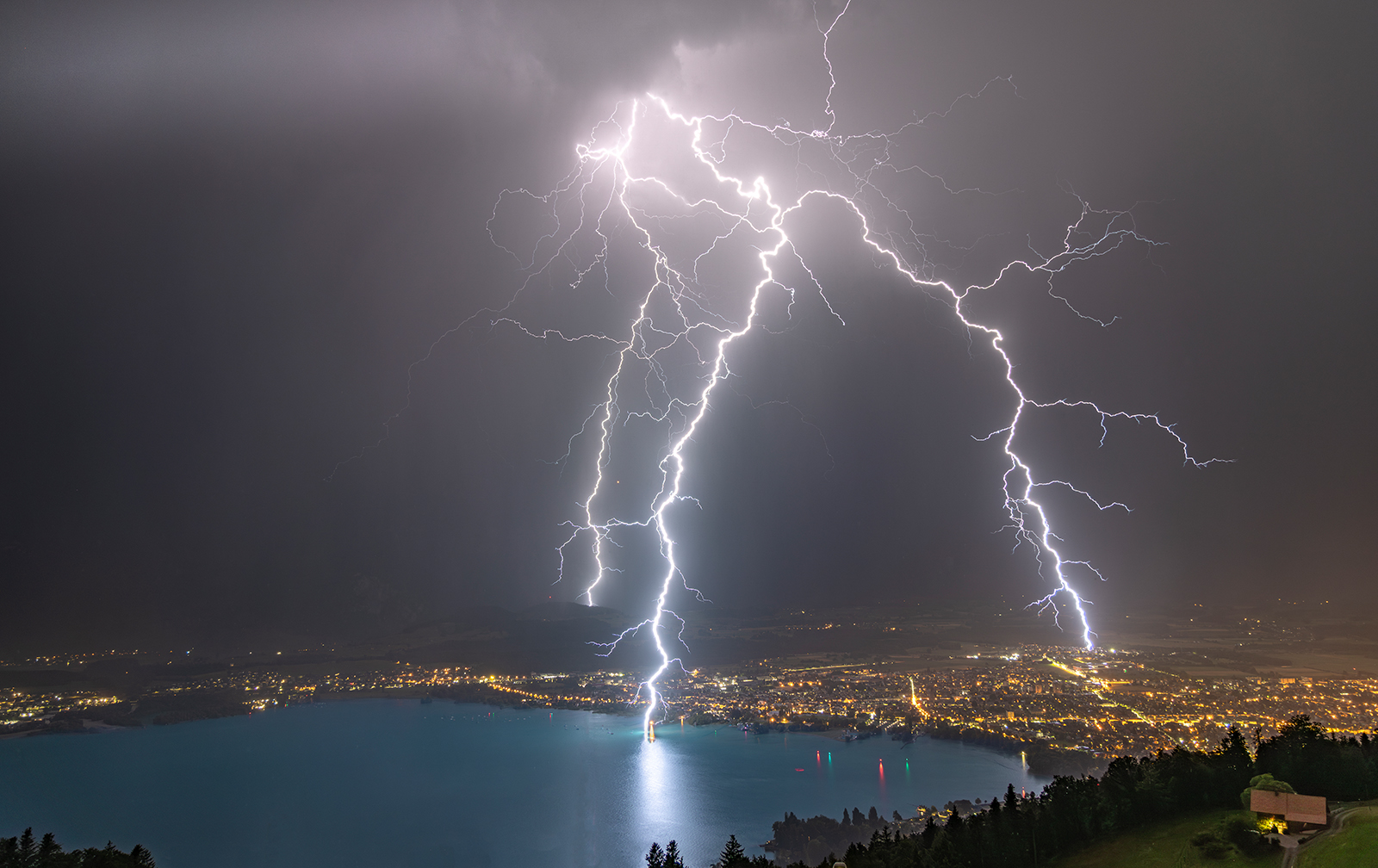 Um 3.42 Uhr gelang ihm mit Stativ und 30 Sekunden Belichtungszeit ein spektakuläres Bild: An gleich drei unterschiedlichen Stellen schlug der Blitz gleichzeitig ein, unter anderem direkt in den Thunersee vor Gwatt. Gemäss der Blitzortung seiner ehemaligen Kollegen von Meteo Schweiz mit einer Stromstärke von –12 Kiloampere, was einem «normalen Blitz» entspreche.
