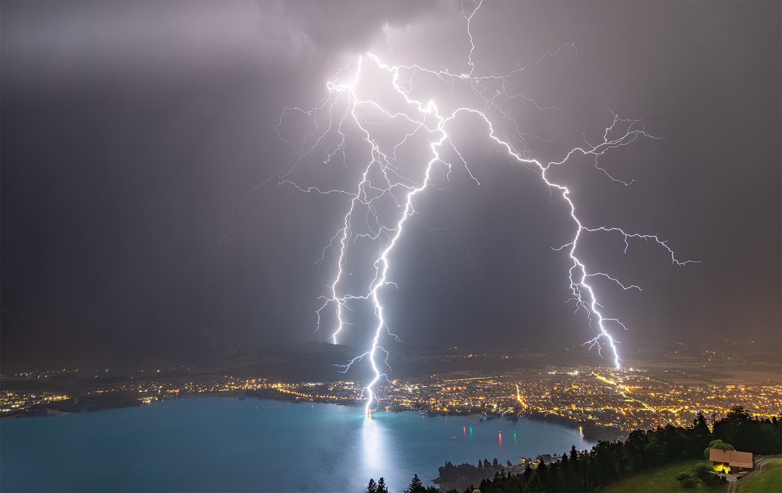 Um 3.42 Uhr gelang ihm mit Stativ und 30 Sekunden Belichtungszeit ein spektakuläres Bild: An gleich drei unterschiedlichen Stellen schlug der Blitz gleichzeitig ein, unter anderem direkt in den Thunersee vor Gwatt. Gemäss der Blitzortung seiner ehemaligen Kollegen von Meteo Schweiz mit einer Stromstärke von –12 Kiloampere, was einem «normalen Blitz» entspreche.
